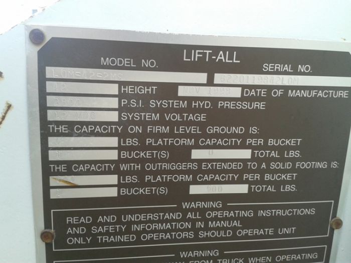 Sistema de Elevacion Lift ALL Modelo LOM42 2MS, con capacidad de 2 personas, cuenta con camara de video trasera 19,334 Hrs. Montado en Camion International Modelo 4900, Transmision Automatica, Pintura Nueva, 277,178 Millas. Equipo Listo para Trabajar.